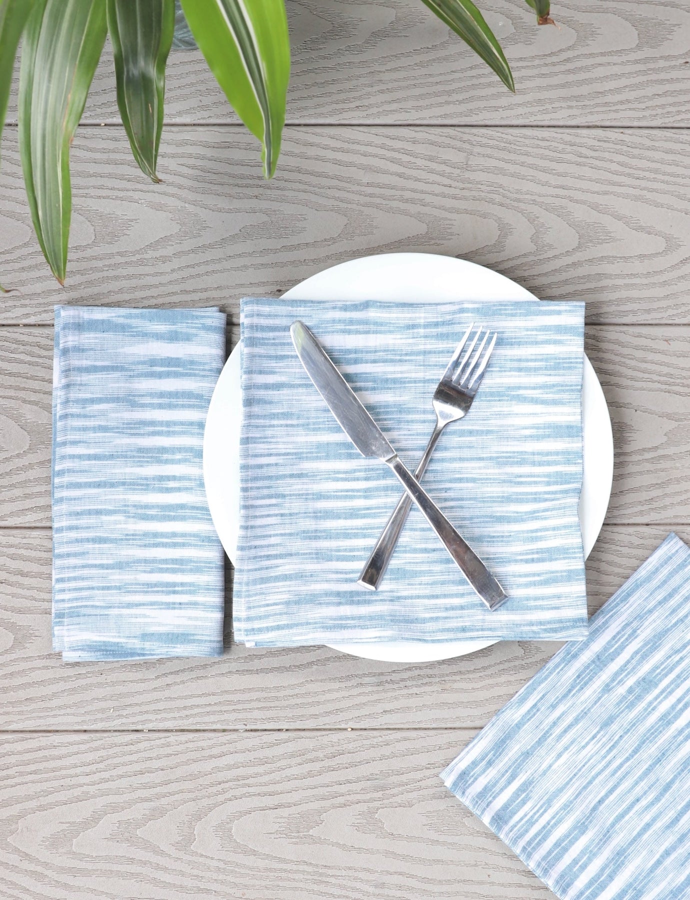 Regular price $36.00 Save $-36.00Say no to paper with these adorable light blue cloth napkins. Perfect for making dinner a little more special and eco-friendly! Made from leftover scrap fabrics from production, these light blue napkins help us reach our mission of being a zero waste company.