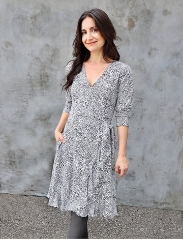 Regular price $114.00 Save $-114.00This is the statement piece your winter wardrobe’s been waiting for. Our ruffle wrap dress features a gorgeous black-on-white hand block print that channels subtle snow leopard energy. Fierce and feminine, it’s made from 100% organic jersey cotton with a graceful ruffle trim, ¾ sleeves, and – of course – pockets. Wear it with heels to see The Nutcracker, boots for a downtown brunch, or flats at the office. This dress does it all!